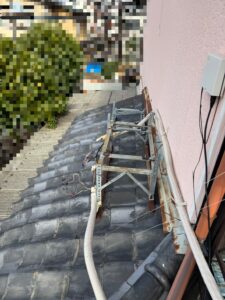 屋根の瓦の上に乗っています。ベランダは鉄格子が有り、入れる事が出来ないので、外からクレーンを使用するしか方法がありません。